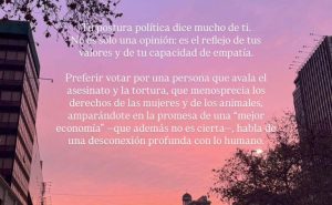 Preferir votar por una persona que avala el asesinato y la tortura, que menosprecia los derechos de las mujeres y de los animales, amparándote en la promesa de una “mejor economía” —que además no es cierta—, habla de una desconexión profunda con lo humano.”